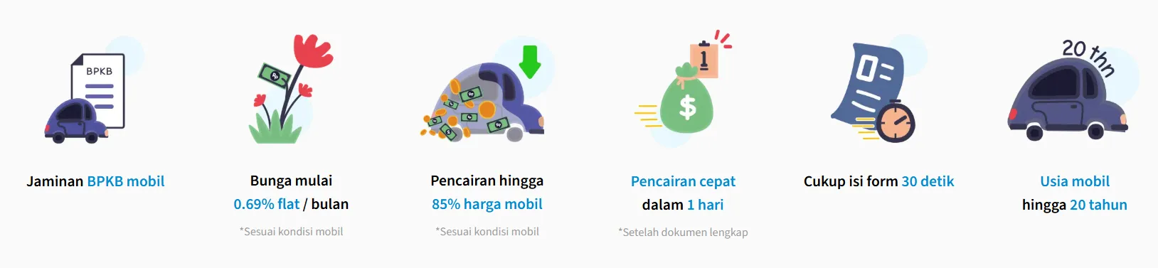 Menerima mobil hingga usia 20 tahun yang berarti lebih banyak kendaraan dapat diterima sebagai jaminan. Hal ini memudahkan bagi pemilik mobil lama yang ingin mengajukan pinjaman.