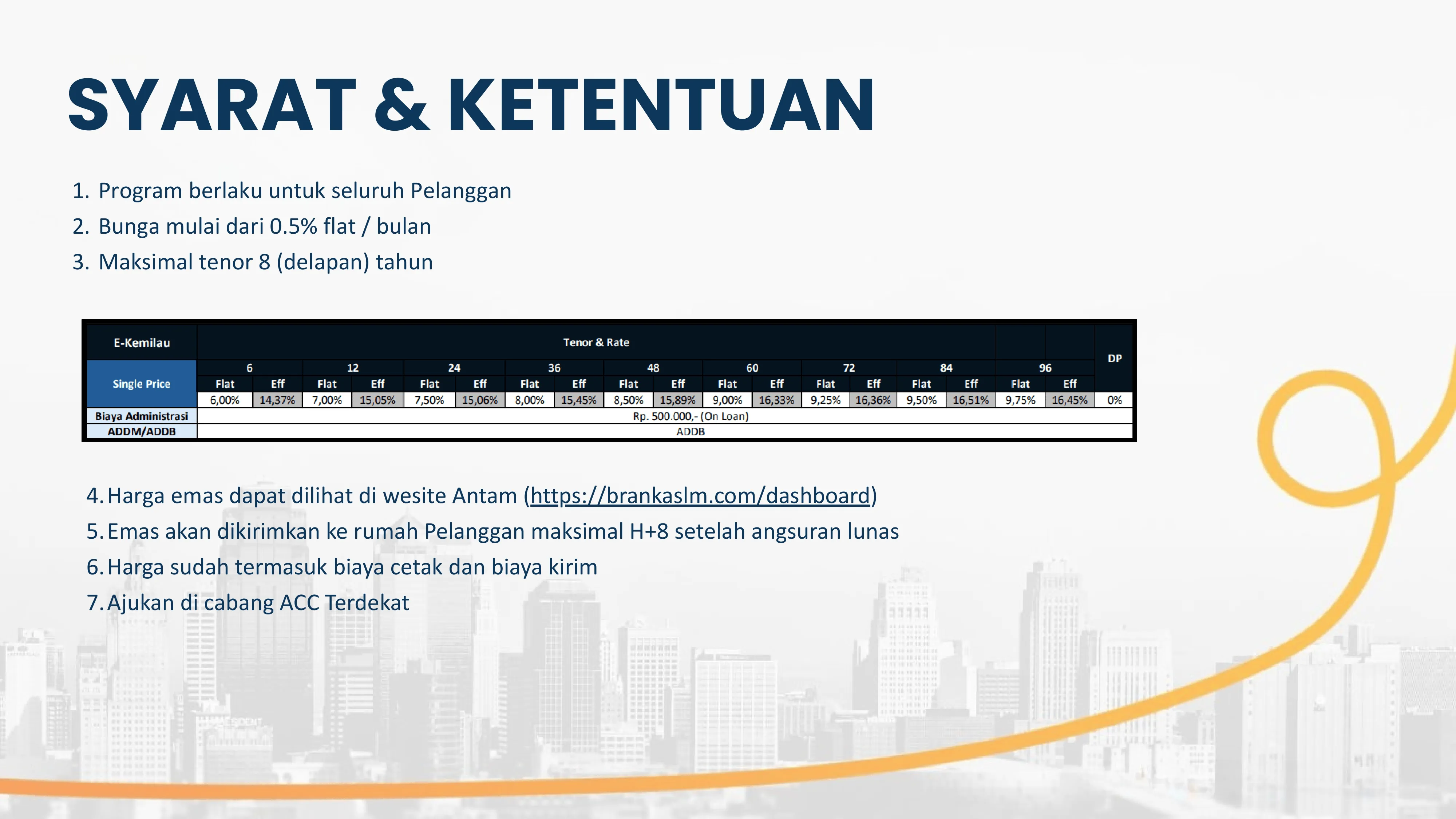 **Simulasi angsuran per orang untuk paket e-Kemilau ACC danaku dengan emas 5 gram dan tenor 8 tahun menggunakan acuan harga emas ANTAM per tanggal 10 Maret 2026 pukul 08:23 WIB. Simulasi ini bersifat ilustratif dan dapat berubah mengikuti harga emas yang berlaku pada saat pengajuan pembiayaan.